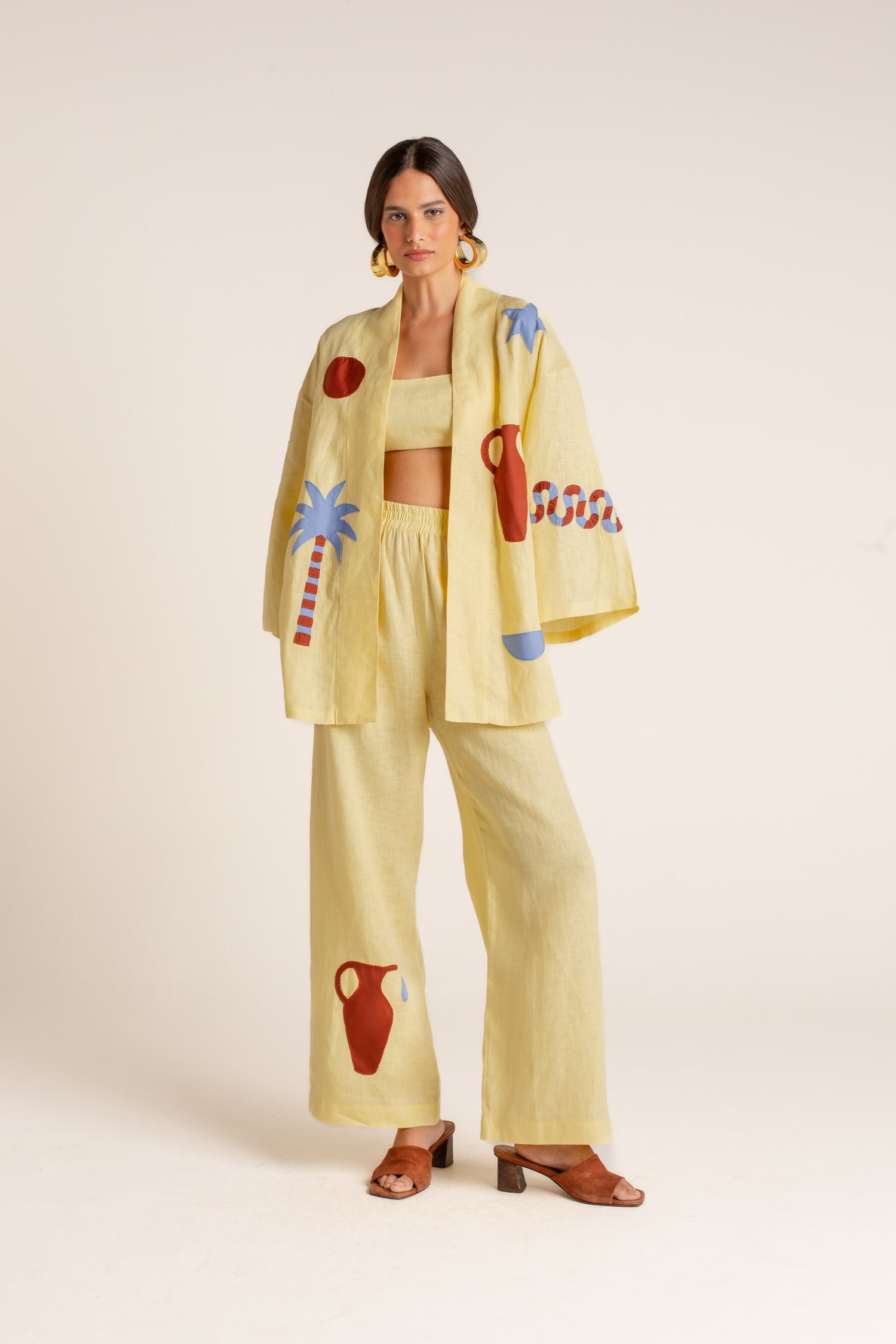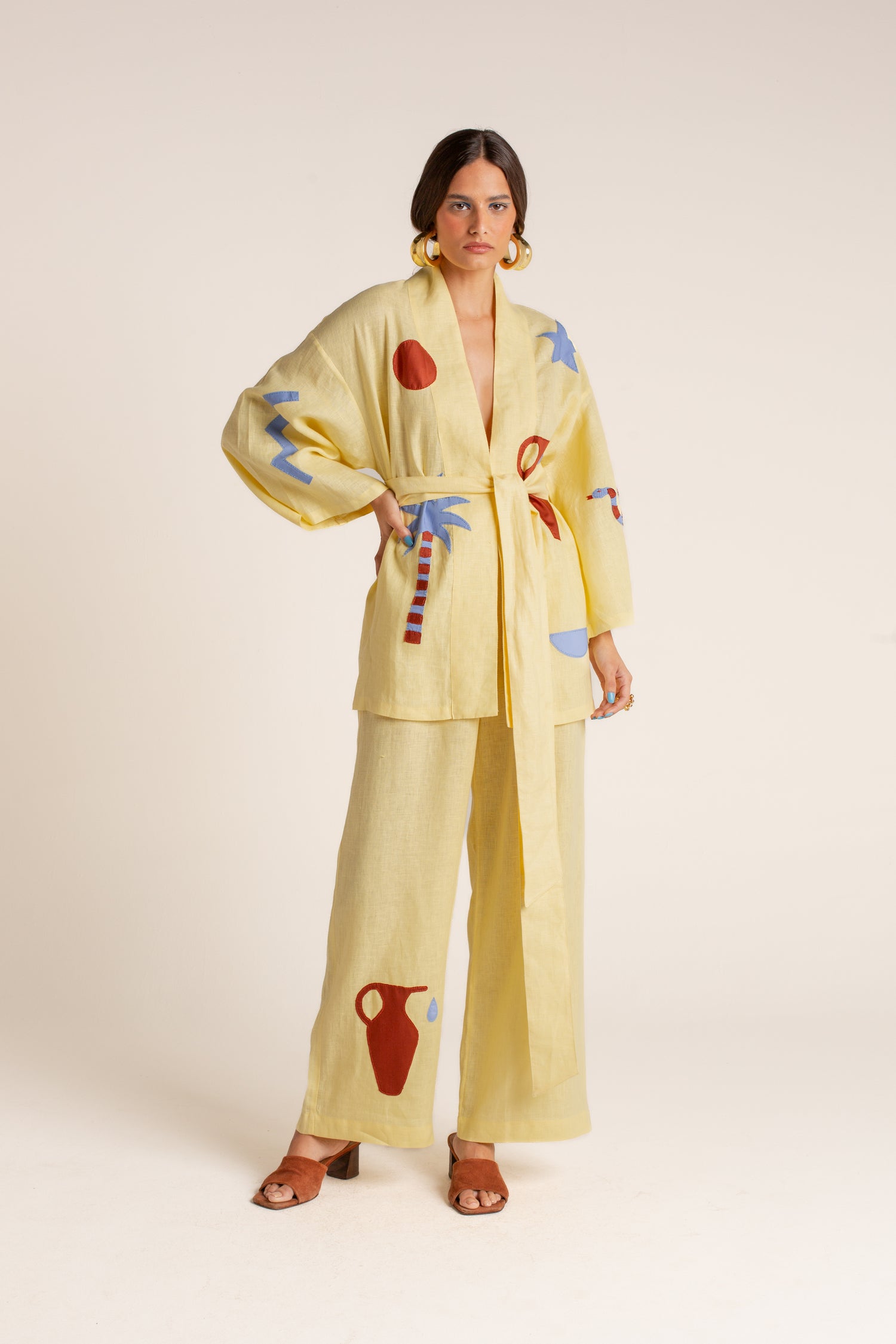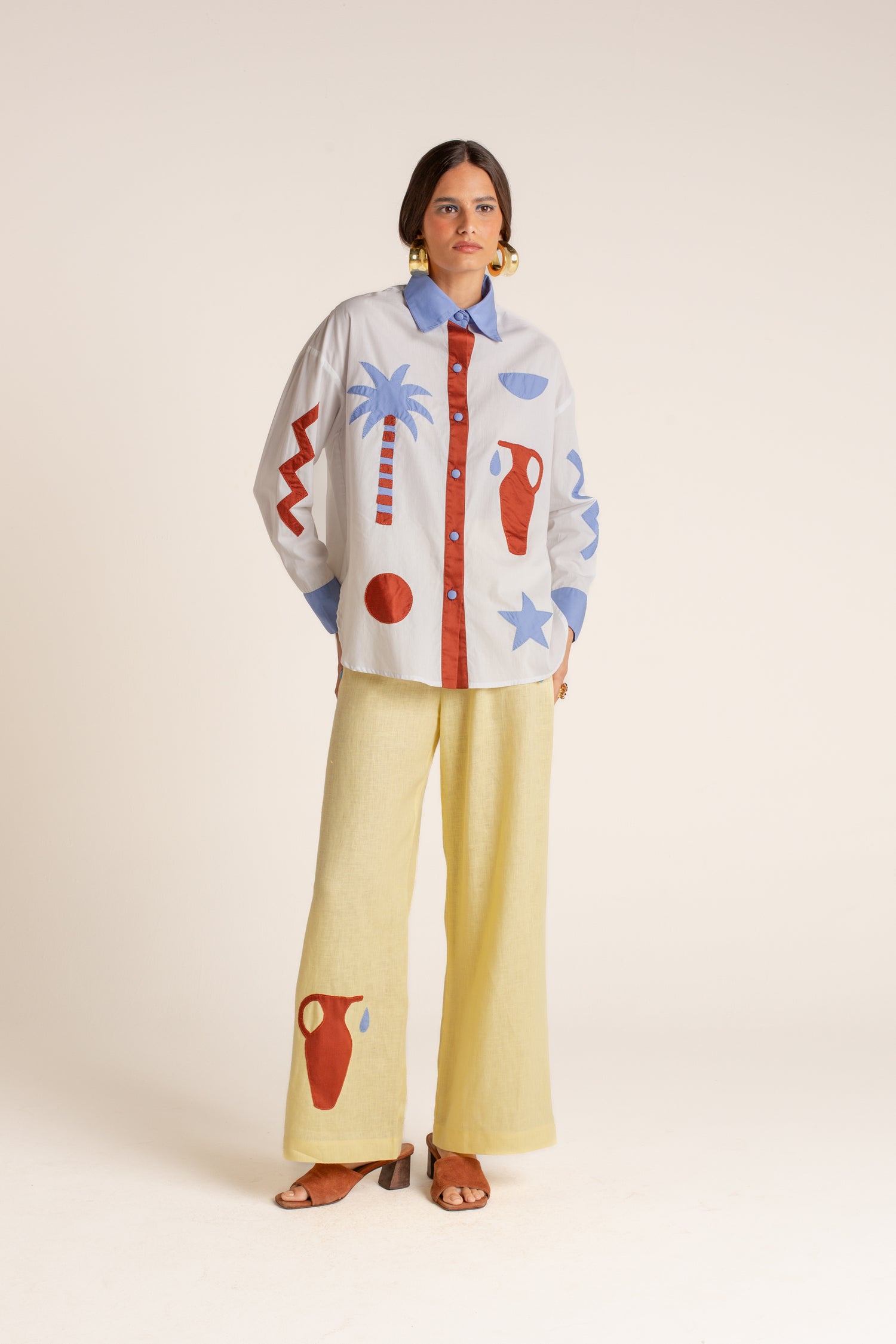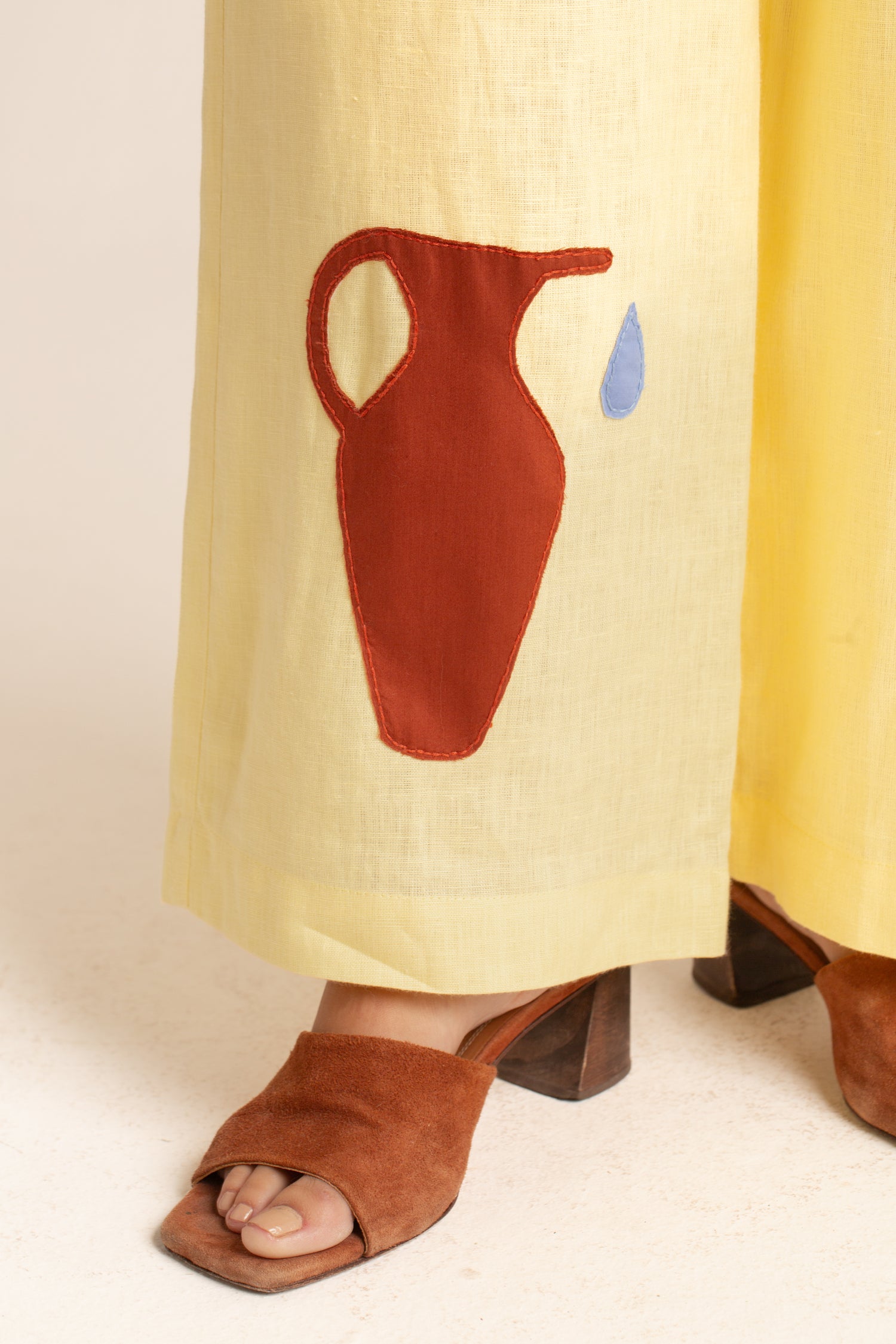 Detalhe de tecido recortado em formato de jarro e bordado à mão.