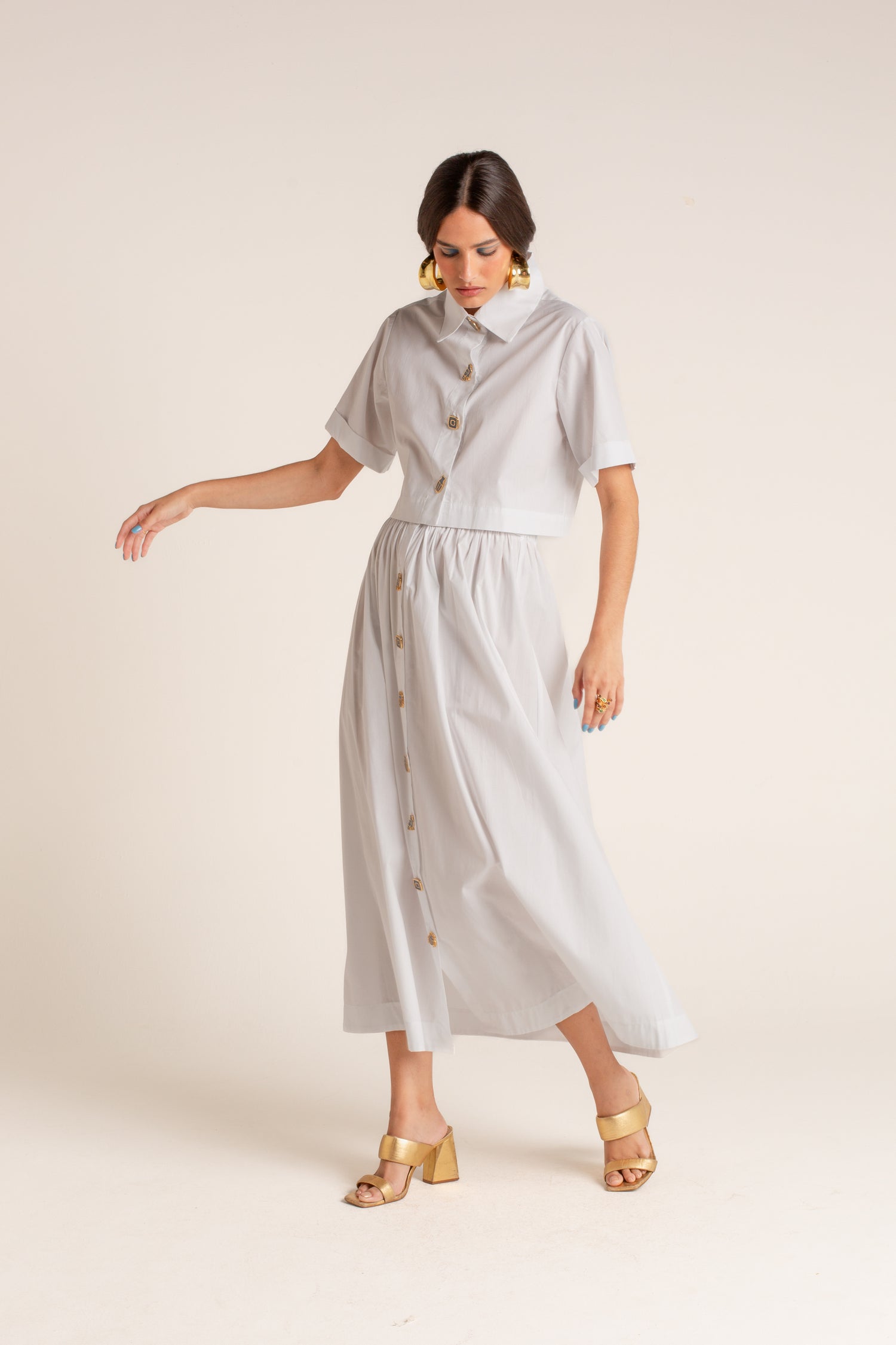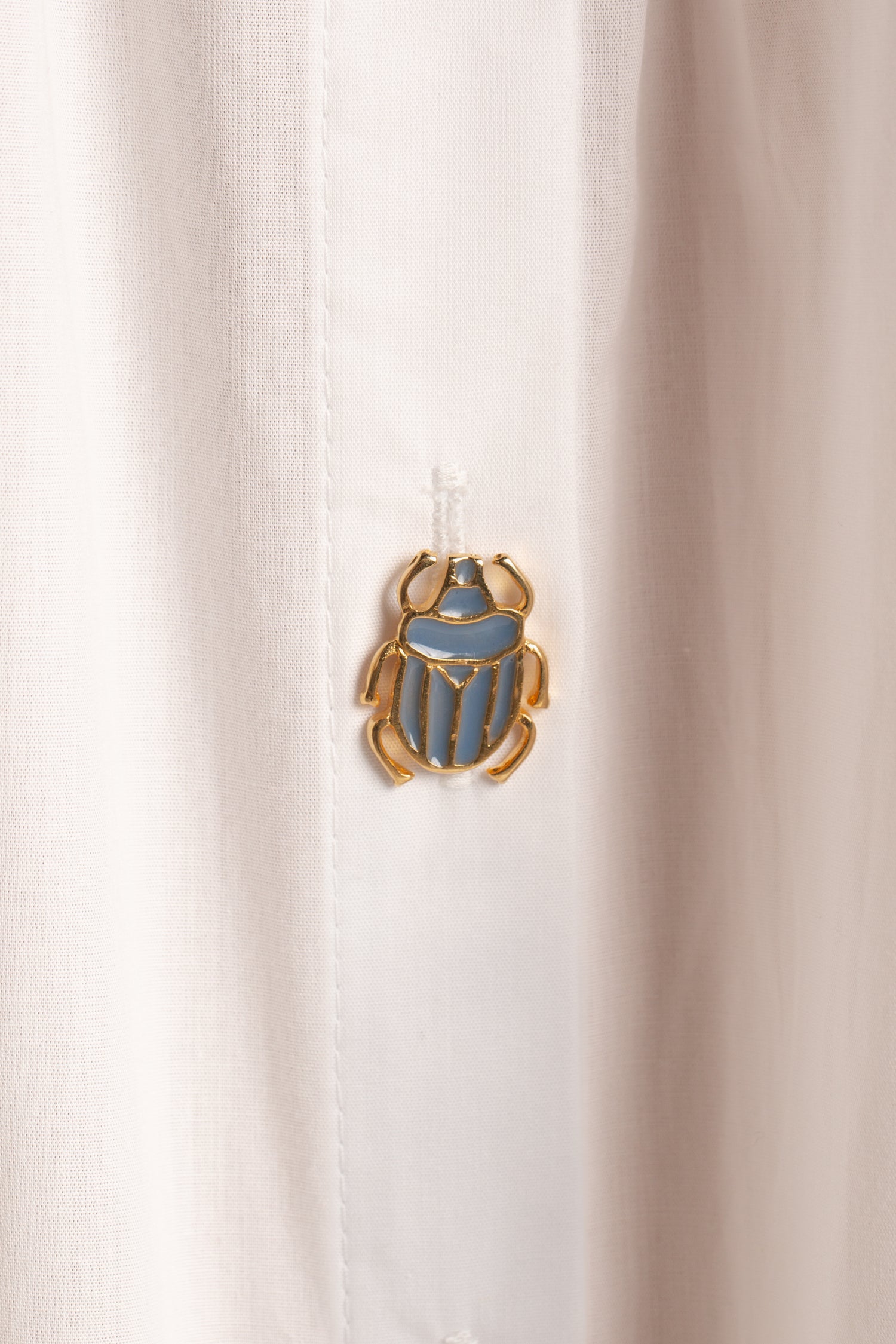 Fechamento frontal por botões de metal autorais inspirados na simbologia egípcia.